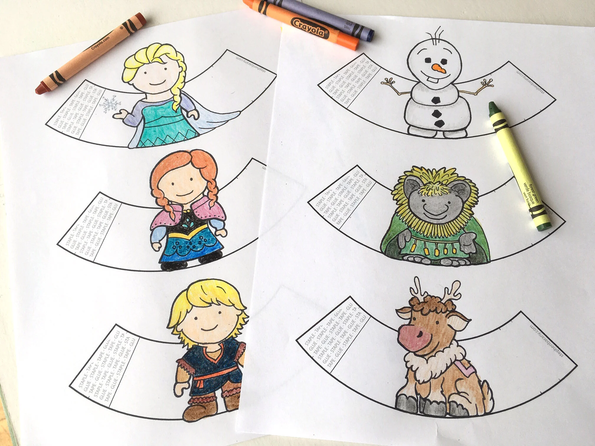 Printable coloring pages of Anna, Elsa, Olaf and Sven from Frozen, Frozen 2, Frozen Fever and Olaf's Frozen Adventure. Anna, Elsa holding hands.