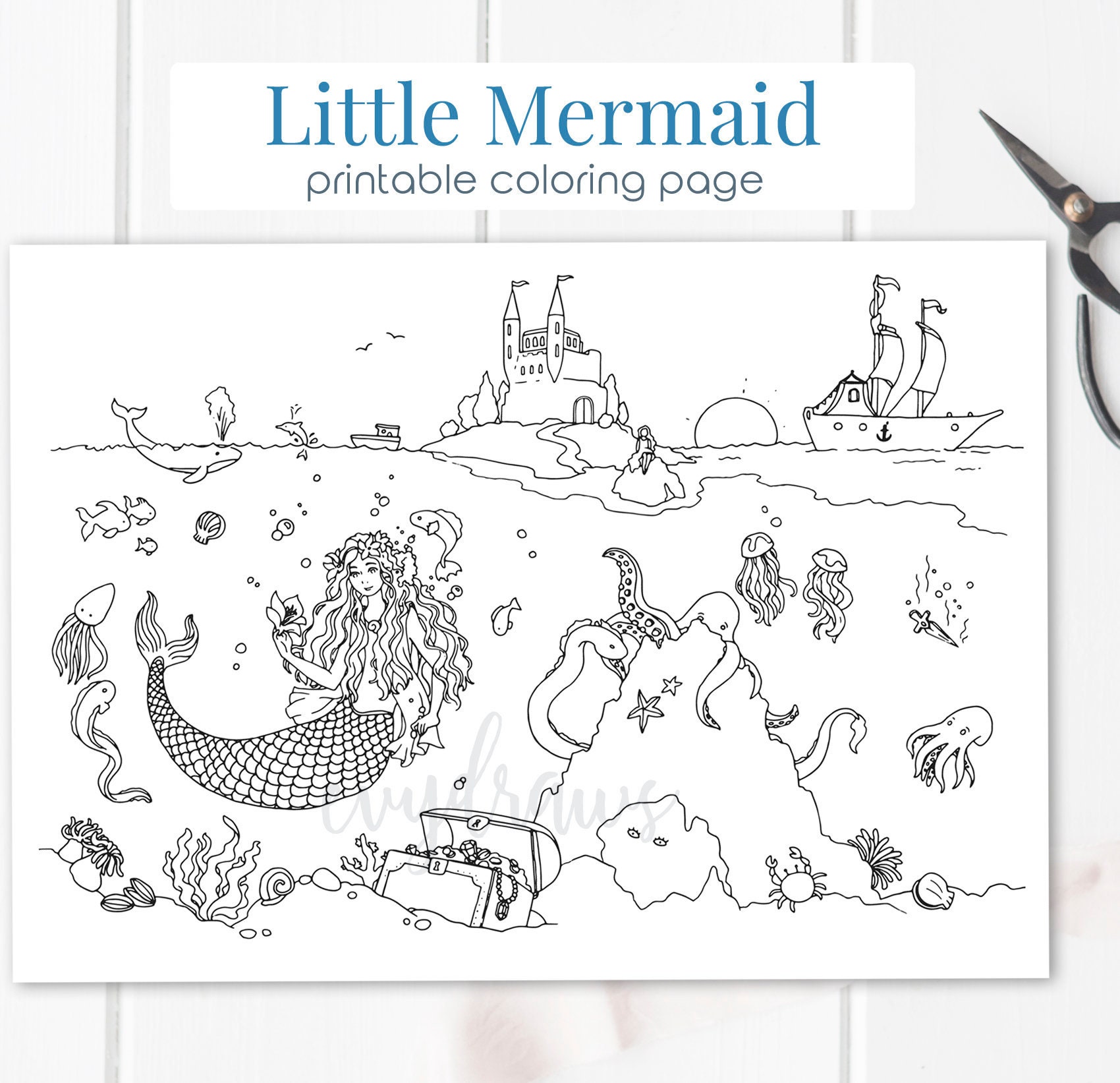 Little Mermaid Fairy Tale Coloring Page | PRINTABLE | Digital Download | Hand Drawn Mermaid Art, Colouring for Kids and Adults, Printables